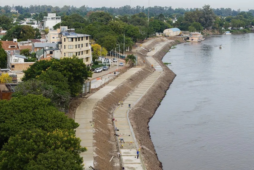 Los trabajos incluyen la defensa fluvial, el recubrimiento del pedraplén, infraestructura pluvial y eléctrica, y mejoras en veredas y senderos de la plaza Italia.