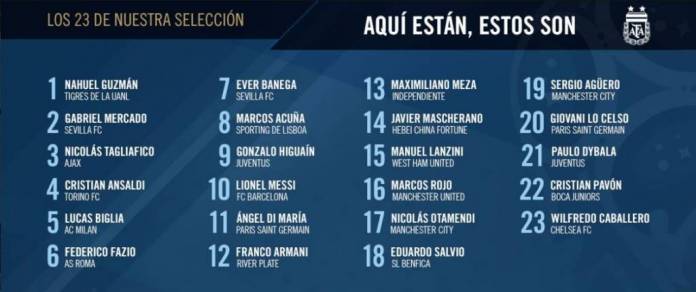 [SELECCIÓN MAYOR] Estos son los números de nuestros 23 seleccionados que defenderán la camiseta de @Argentina en la Copa Mundial de la FIFA Rusia 2018 pic.twitter.com/pDvJTFJ7rf
