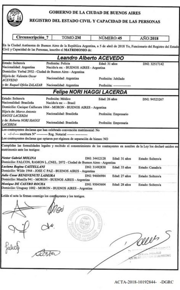Leandro Alberto Acevedo contrajo matrimonio con Felipe Nori Haggi Lacerda, uno de los brasileños que ejercía con un título falsificado.