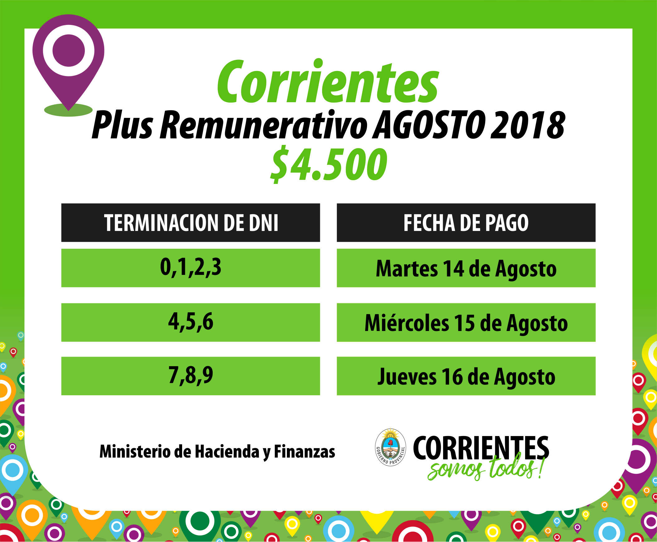 El gobernador Gustavo Valdés anunció hoy, a través de su cuenta de twitter (@gustavovaldesok), el inicio del pago del plus remunerativo de $4.500 correspondiente a agosto y confirmó que abonará a partir del martes 14 y en tres días. En este sentido, el ministro de Hacienda y Finanzas, Enrique Vaz Torres, afirmó que el monto de inversión que realiza la Provincia en este beneficio asciende a $360 millones.