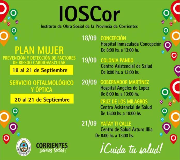 El Instituto de Obra Social de la Provincia de Corrientes (IOSCOR) informó que en el marco del Plan Mujer, ofrecerá atención en el interior provincial a sus afiliadas, en prevención y detección de factores de riesgo cardiovascular, en este caso, entre el 18 y el 21 de septiembre, al igual que servicio oftalmológico y óptica, del 20 al 21 de septiembre.