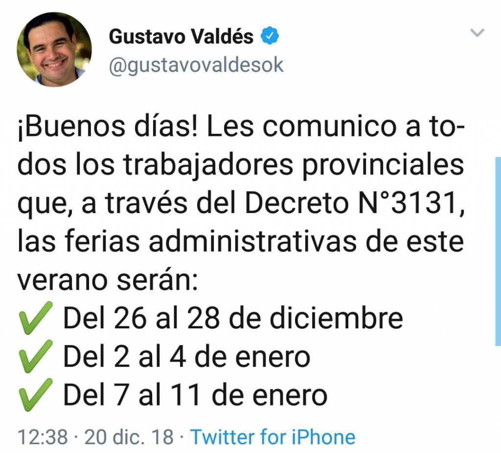 El comunicado de la red social dirigido a todos los trabajadores provinciales confirma que “a través del Decreto N°3131, las ferias administrativas de este verano serán, del 26 al 28 de diciembre, el periodo extraordinario y en dos tramos el ordinario que se divide, del 2 al 4 y del 7 al 11 de enero”; el mismo alcanza a todas las reparticiones de la Administración Pública provincial central y organismos descentralizados y autárquicos, con excepción de las áreas de seguridad, el Instituto de Cardiología de Corrientes y la Dirección Provincial de Energía (DPEC).