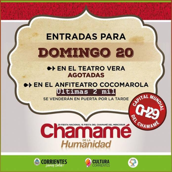 La última noche de la 29º Fiesta Nacional del Chamamé iniciará este domingo, a partir de las 18 horas. Desde las 17 horas, se podrá adquirir el remanente de 2 mil entradas en las puertas del Anfiteatro Mario del Tránsito Cocomarola. Este será el único punto de venta para el domingo, según informaron desde el Instituto de Cultura de la Provincia de Corrientes.