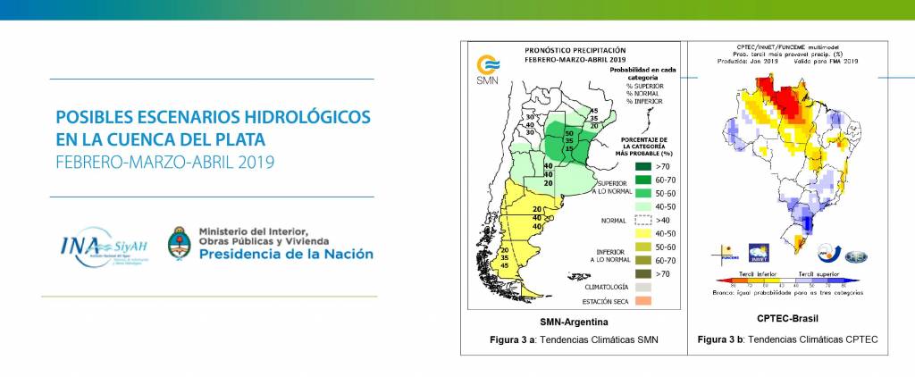 Se presentan además los mapas de tendencias climáticas de consenso elaborados en el Servicio Meteorológico Nacional (SMN) de Argentina y por CPTEC e INMET de Brasil, correspondiente a precipitaciones acumuladas en el trimestre febrero-marzo-abril de 2019.