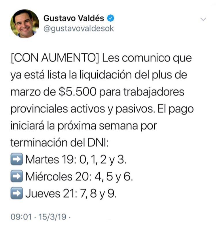 Según anticipó el gobernador Gustavo Valdés, el próximo lunes se conocerán detalles de la recomposición de la pauta salarial para los empleados del estado. Además a través de su cuenta de twitter, Valdés informó que a partir del martes 19 empezará a abonarse el plus de marzo de $5.500 para la administración pública provincial, tanto para el sector activo como pasivo.