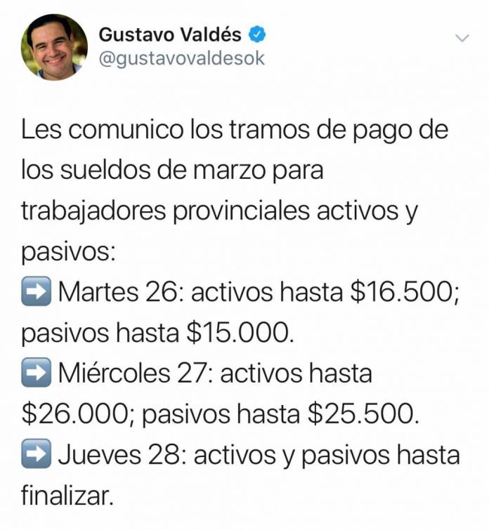 El gobernador Gustavo Valdés comunicó a través de su cuenta de twitter que a partir de este martes 26, empezarán a abonarse los sueldos del mes de marzo para la administración pública provincial, activos y pasivos, de acuerdo al siguiente cronograma de pagos: