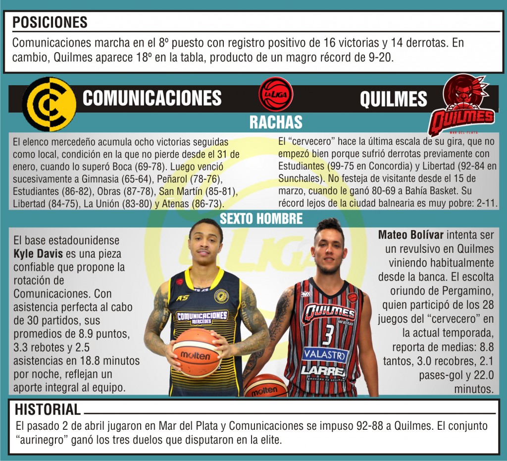 Comunicaciones (16-14) quiere continuar haciéndose fuerte en Mercedes, cuando reciba esta noche a Quilmes (9-20) de Mar del Plata en la continuidad de la fase regular de la Liga Nacional de Básquetbol.